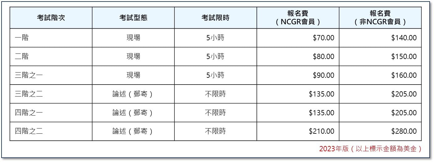 美國當地認證考試日期依各地分會或舉辦單位有所不同,自2021年起NCGR-PAA亦陸續提供線上考試,有意報考者敬請關注NCGR各地分會或NCGR-PAA網站公告。