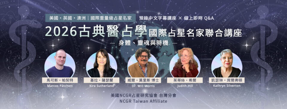 本系列講座邀集來自美國、英國與澳洲的五位重量級占星名家,內容聚焦於占星傳統中關於身體、心靈與時機的核心觀點。