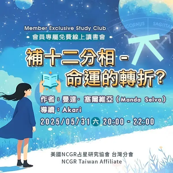 台灣分會-會員專屬線上讀書會 本次主題:補十二分相 – 命運的轉折? 日期:2025年05月31日(六)時間:20:00 – 22:00費用:免費,會員專屬讀書會(還不是會員?歡迎加入NCGR) 地點:Zoom線上會議室(依會員電郵進行雙重驗證) 大綱摘要: 在占星學中,有一種低調又神秘的相位——補十二分相(Quincunx),即150度相位,也被稱為「梅花相位」。它不像「合相」那樣強烈,也不像「對沖相位」般鮮明,但卻如同人生中無法預期的轉折點,悄悄地隱藏著重大變化的暗示。 你是否曾經疑惑,為什麼有些人的生命看似平靜無波,卻突然遭遇劇烈轉折?有些人經歷突如其來的改變,從此人生截然不同? 在這次的讀書會裡,我們將深入探討一篇研究補十二分相的文章,作者透過多位名人與歷史人物的星盤研究,揭露了一個令人驚奇的現象: 那些擁有150度相位的人,往往經歷出人意料的生命轉折,這些事件包括親人的驟然離世、意外事故、職涯大轉變,甚至是奇特的幸運事件。 但請放心,這次讀書會並非談補十二分相的不可捉摸。我們要透過這個研究題,來思考一個更深刻的問題: 「假設150度有效,納入解盤,有幫助嗎??」 150度相位向來被認為是可能會帶來不幸和麻煩的相位,本命中有此相位的人,可能會遇到足以改寫整個人生走向的重大事件,那麼,真的就是這樣嗎? 作者為了驗證此一說法,做了一個研究,本文就是她的研究心得。 如果你也曾好奇自己的生命轉折點是否與補十二分相有關,或單純被生命的神秘與占星學深深吸引,這場讀書會絕對值得你來參加。 本文選自 NCGR Syzygy占星調查研究年鑑 – 2024年秋季號 第43-49頁 作者簡介: 曼達·塞爾維亞(Manda Selva) 持牌臨床社會工作者(加洲),NCGR-PAA研究主管。早年開始研習占星,於三藩市灣區從事占星諮詢及心理治療工作。理科出身的她熱衷於以實證方法應用以及研究占星學。她提供占星諮詢,撰寫博客,曾於NCGR、ISAR及其他占星組織發表演講。導讀簡介: Akari 職場小咖。2019年起研習占星,現為智者星象學院學生。2020年取得STA Horary Practitioners 資格。2024年通過NCGR-PAA二階考試。 本活動為台灣分會會員專屬之免費線上讀書會開放會員自發性導讀或發表,或會員朋友的線上小聚,談談近期天象與交換心得。